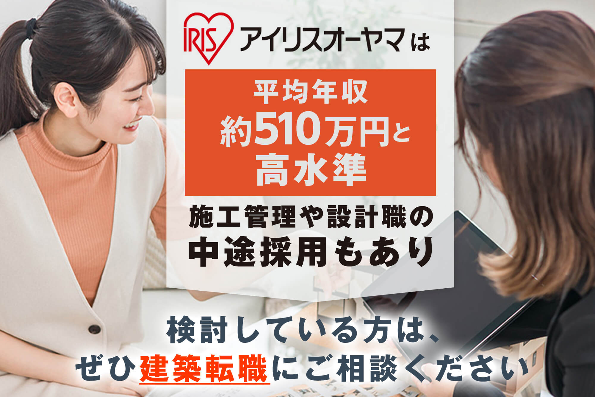 転職活動を効率的に行うためには、建築業界に特化したエージェント「建築転職」に相談するのがおすすめです。アイリスオーヤマをはじめとした、土木・建築会社の求人が豊富な「建築転職」を利用してみましょう。