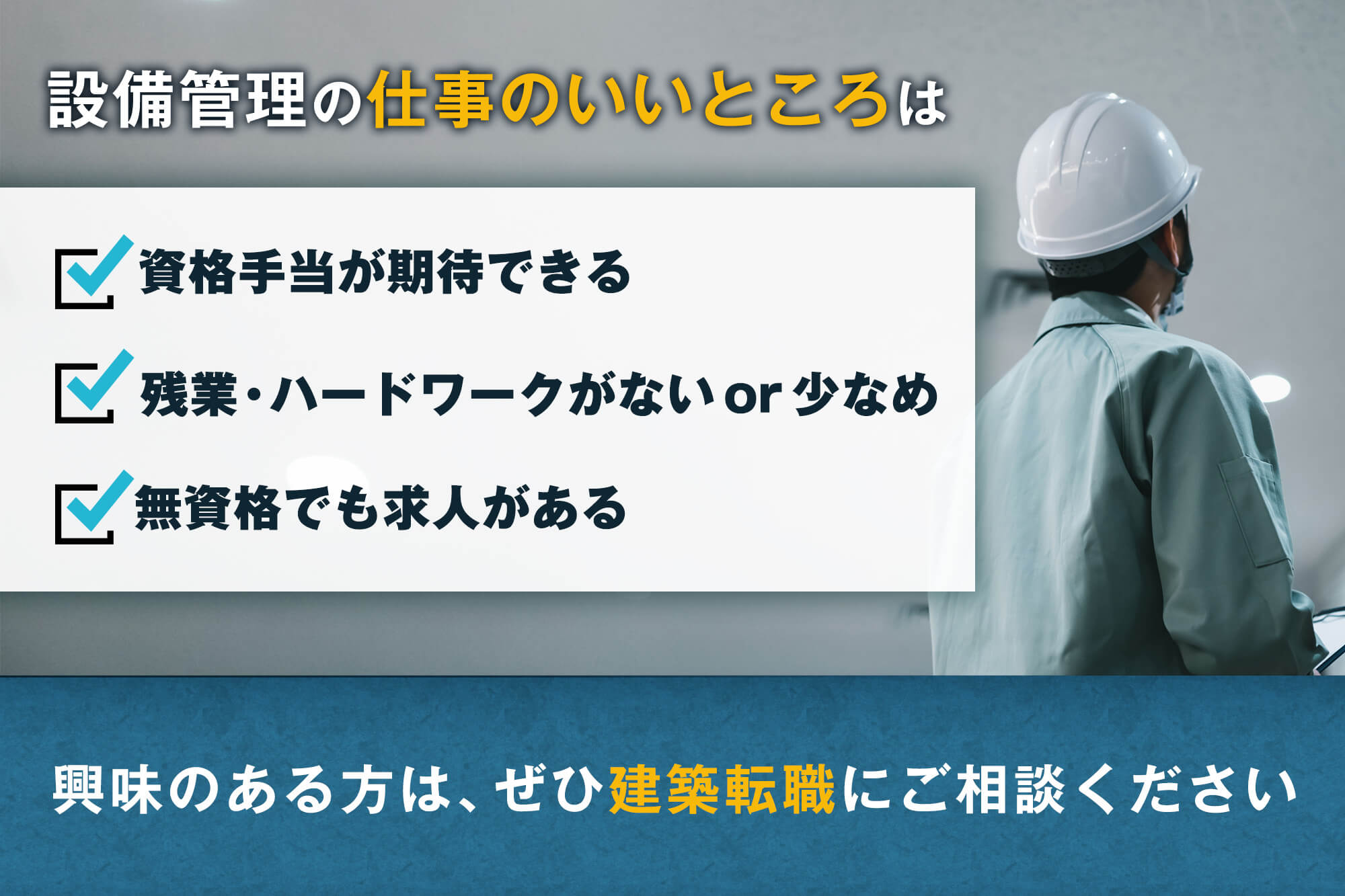 建築業界専門の転職エージェント「建築転職」では、上記以外にも設備管理の求人を取り扱っています。登録いたただいた方には非公開求人情報も紹介しておりますので、ぜひ下記から無料登録ください。